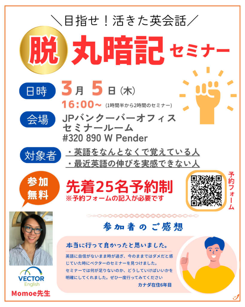 当時カナダ歴6 年が過ぎようとしていた頃でした。英語に自信がないまま時が過ぎ、今のままではダメだと感じていた時にベクターのセミナーを見つけました。