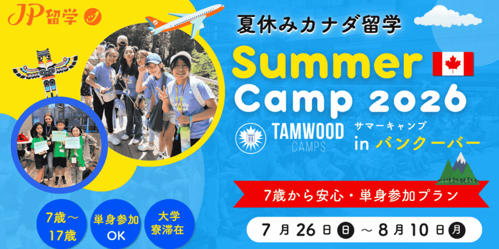 2026年のJP留学特別プログラムは2026年7月26日(日)出発~8月10日(月)のスケジュールになります。7歳からの単身参加もOKです。この夏、カナダでとびきりの思い出を作ってみませんか?