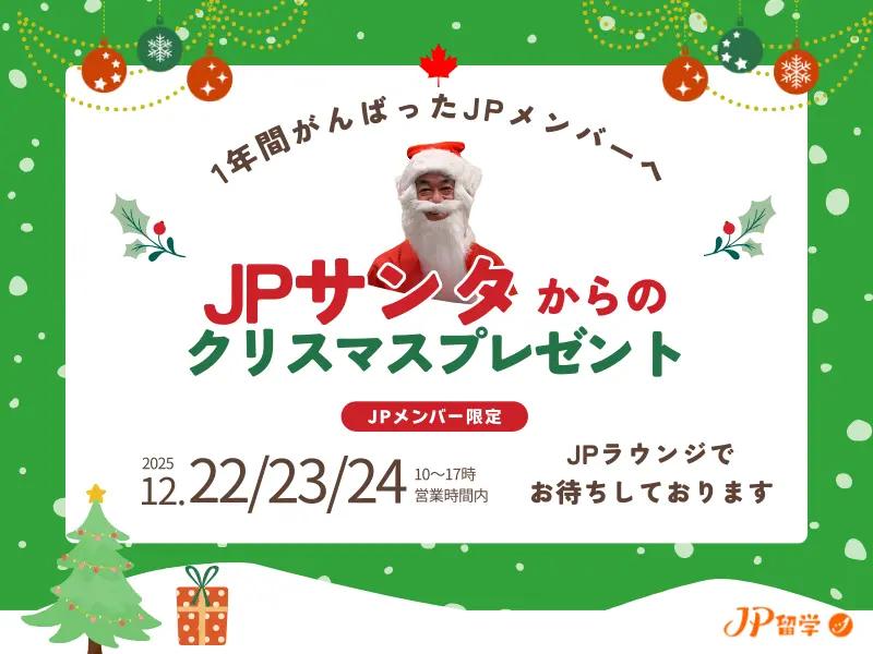 現地情報 実りある留学を実現中!現地でのJP留学生 NEWS JP留学全オフィス(バンクーバー・トロント・日本)の年末年始の営業日ご案内につい… 投稿日 2025年12月17日 NEWS カナダ Vanwestのリアルレビュー|JPメンバーの学校感想まとめ 投稿日 2025年12月13日 カナダ NEWS JPサンタからのクリスマスプレゼントが届きますよ~! 投稿日 2025年12月12日 NEWS カナダ JPラウンジのひととき:バンクーバーの冬に届いた日本のお菓子の差し入れ 投稿日 2025年12月10日 カナダ カナダ 【Co-op留学体験談】ずっとやりたかった仕事 | カナダのギフトショップで働く… 投稿日 2025年12月6日 カナダ 現地情報 クリスマスの魔法 | カナダのサンタさんからお手紙が届く方法 投稿日 2025年12月5日 現地情報 35 記事 カナダ 最近の投稿 Vanwestのリアルレビュー|JPメンバーの学校感想まとめ JPラウンジのひととき:バンクーバーの冬に届いた日本のお菓子の差し入れ 【Co-op留学体験談】ずっとやりたかった仕事 | カナダのギフトショップで働くJPメンバーにインタビュー! 6 記事 セミナー 最近の投稿 【JPメンバー限定】お仕事探しセミナー開催のお知らせ 【JPメンバー限定】お家探しセミナーのお知らせ 【発音のクセ】12/4日本人のための”発音お悩み”セミナー 5 記事 ニュース 最近の投稿 カナダ留学も対象!東京グローバルパスポートで大学生の留学費用を最大295万円支援 カナダの感謝祭(Thanksgiving)とは?祝日の意味と留学生の過ごし方 カナダ留学フェア秋 ここから始まるカナダ留学 東京・大阪で開催されるフェア&個別相談会