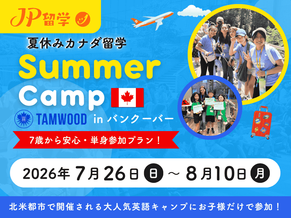 世界中の子どもたちのために30年以上に渡り国際サマーキャンプを提供するタムウッド。キャンプ開催地はバンクーバーの有名大学 UBC -University of British Columbia と、SFU -Simon Fraser University です。広大なキャンパスの中にある寮に滞在し、大学の施設を利用して英語クラスやアクティビティを実施、現地留学生になったような気分を味わえるところもタムウッドサマーキャンプの魅力です。2026年度 特設ウェブサイトをご覧ください!